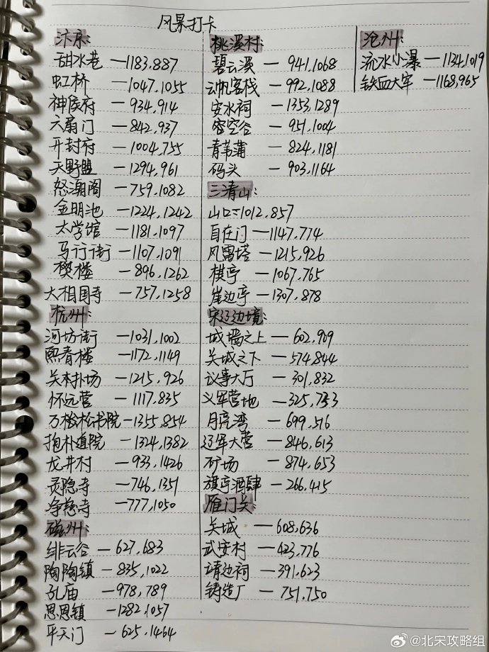 甚至游戏里每一处风景区、探索点,都有学霸手写坐标打卡点,攻略做到事无巨细: