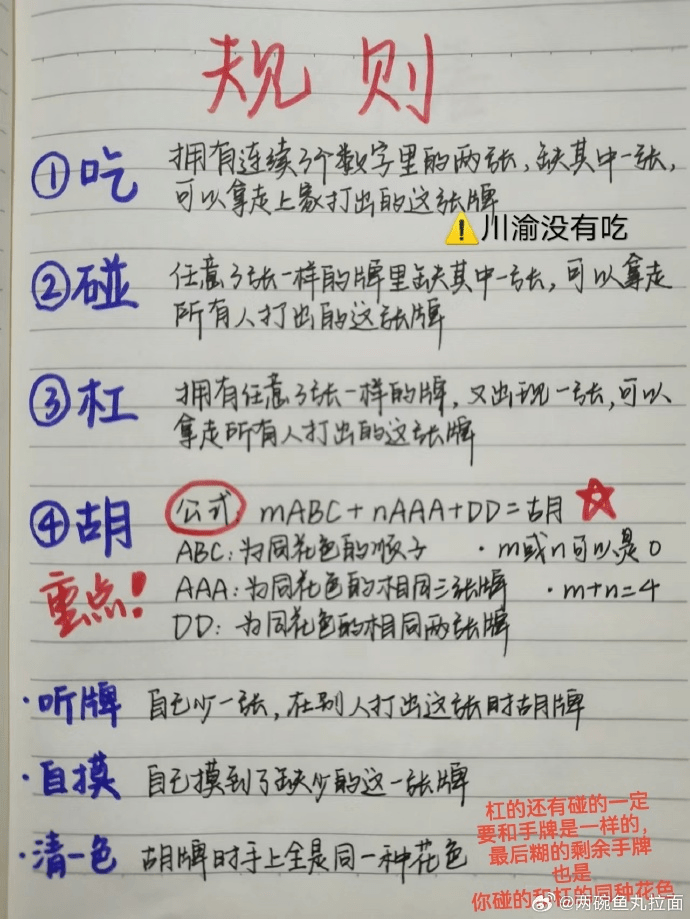 学霸的笔记中,把每一个流程和技巧都写得清清楚楚,从认牌、抓牌到胡牌……基本上一个不会麻将的同学,只要认真研读就能学会基础的麻将技巧,可以直接上桌打了!
