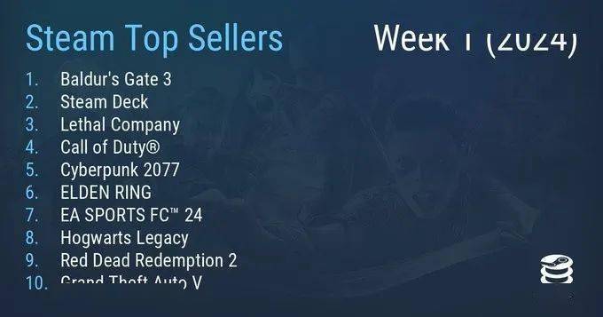 本周的Steam游戏销售情况排名公开,上个月刚刚夺得TGA年度游戏的《博德之门3》势头正盛,而又赶上了本次V社Steam的冬日促销,理所当然地占据了榜单头部。