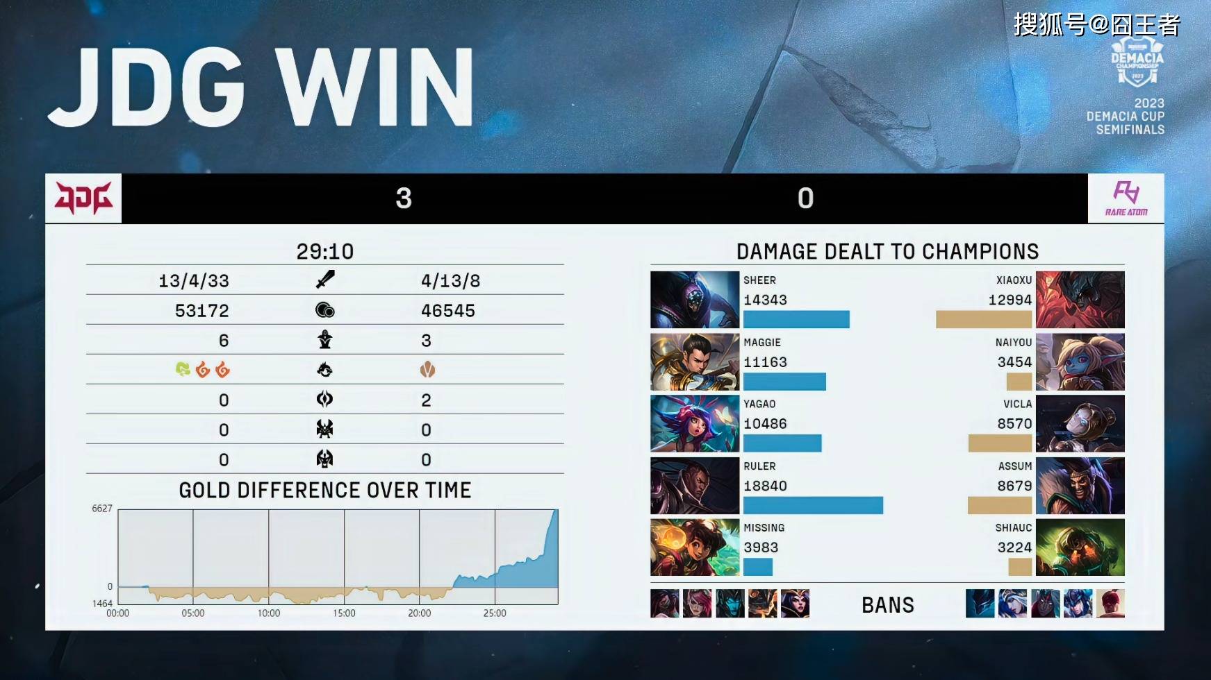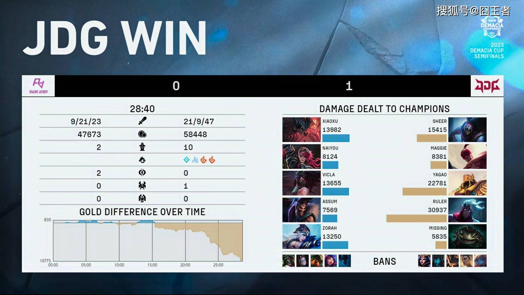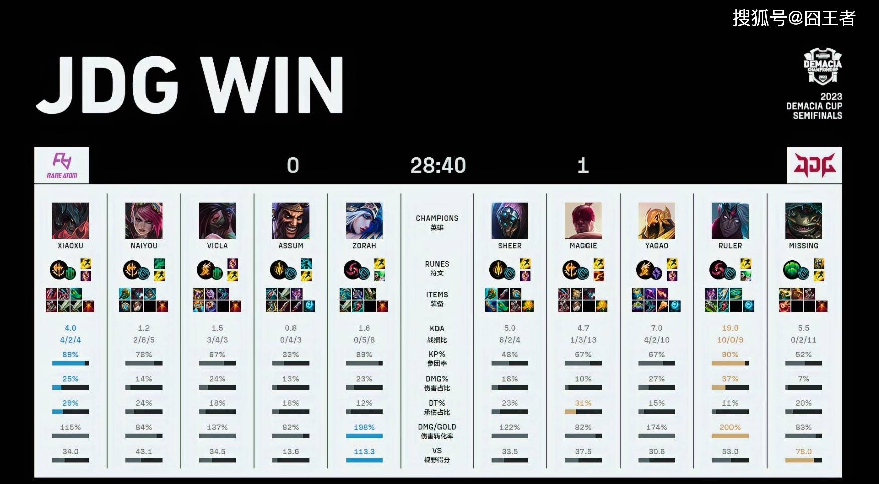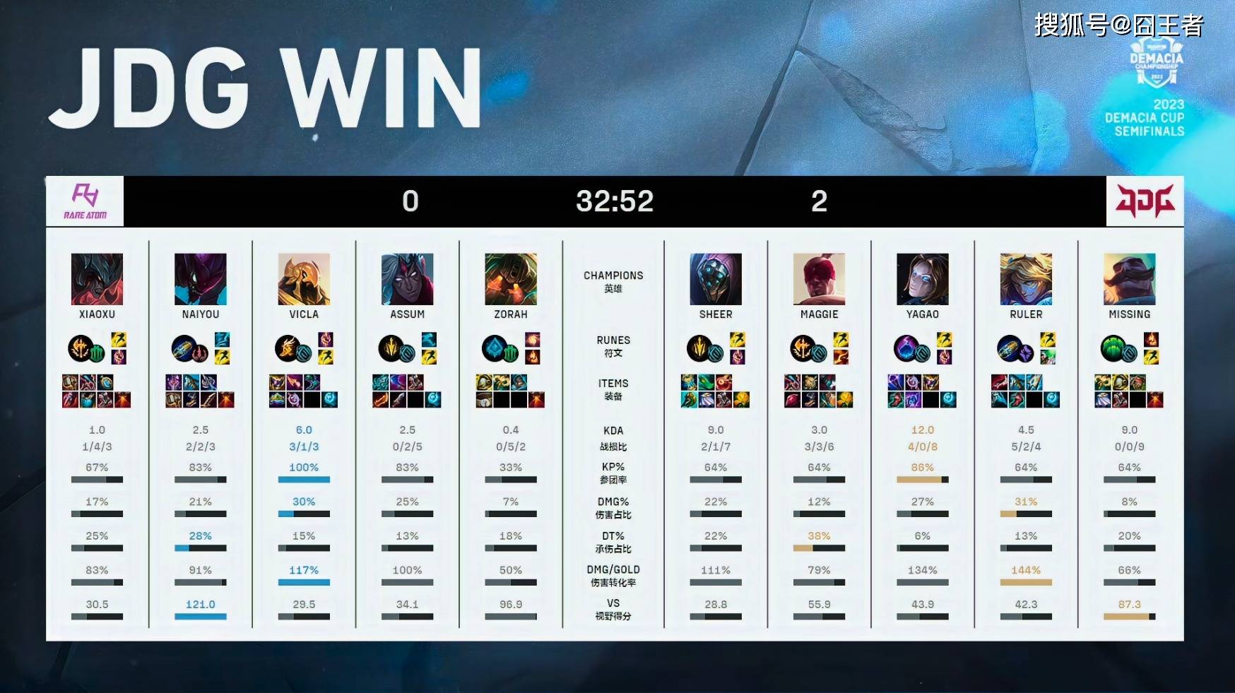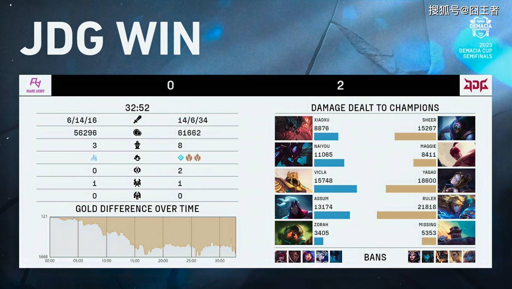 结果两队在前15分钟,打得异常胶着,经济交替领先,谁也无法有效的将优势转为胜势。转折点出现在第16分钟左右的小龙团上,塔姆持续追击,配合JDG双C打出0换4完美团后,JDG完全接管后续比赛;21分钟,两队在中路爆发团战。RA中野强切尺帝失败后,JDG打出2换4好团后,轻松斩获大龙;28分40秒,JDG打出3换5后,一波拿下比赛胜利。