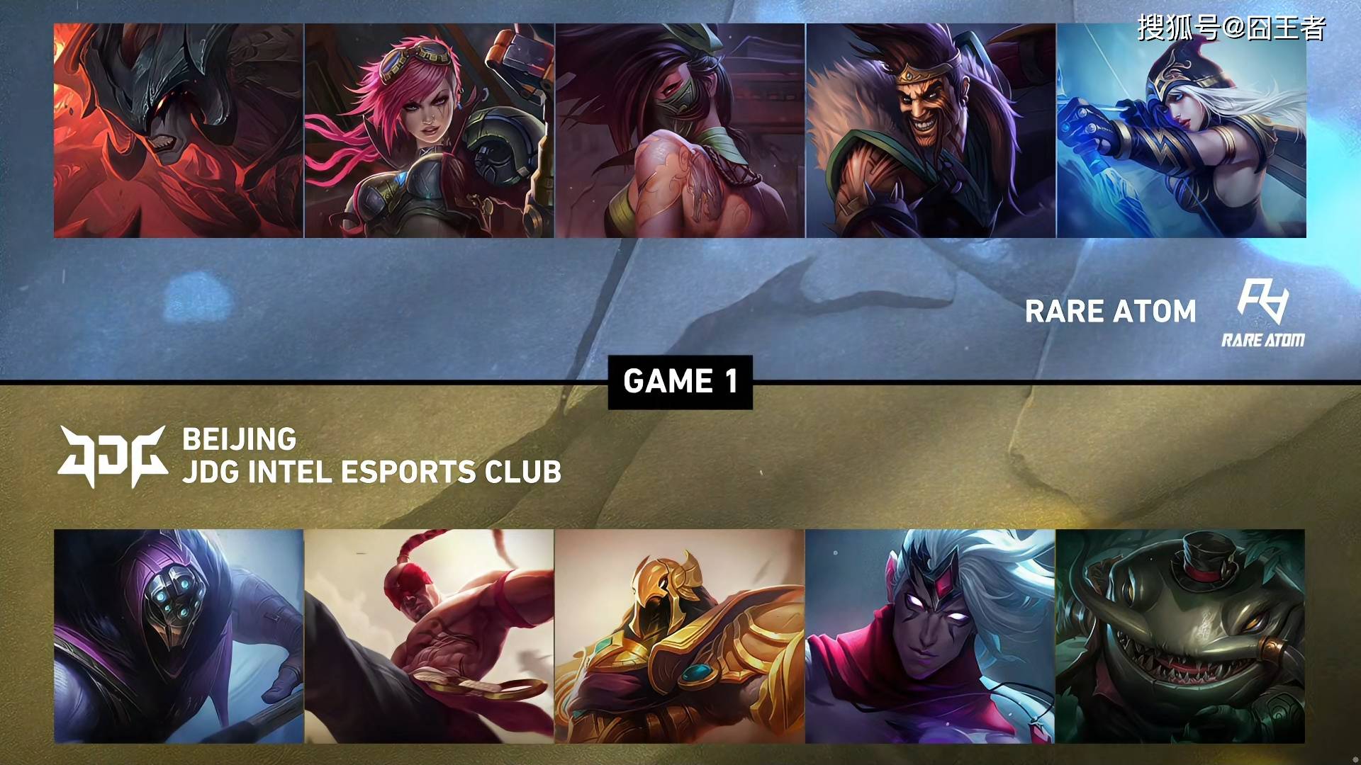第一局比赛,RA蓝色方,禁用梦魇、妮蔻、泰坦、发条、烈娜塔,选用剑魔、蔚、阿卡丽、德莱文、艾希;JDG红色方,禁用妖姬、卡莉斯塔、兰博、芮尔、波比,选用贾克斯、盲僧、沙皇、韦鲁斯、塔姆