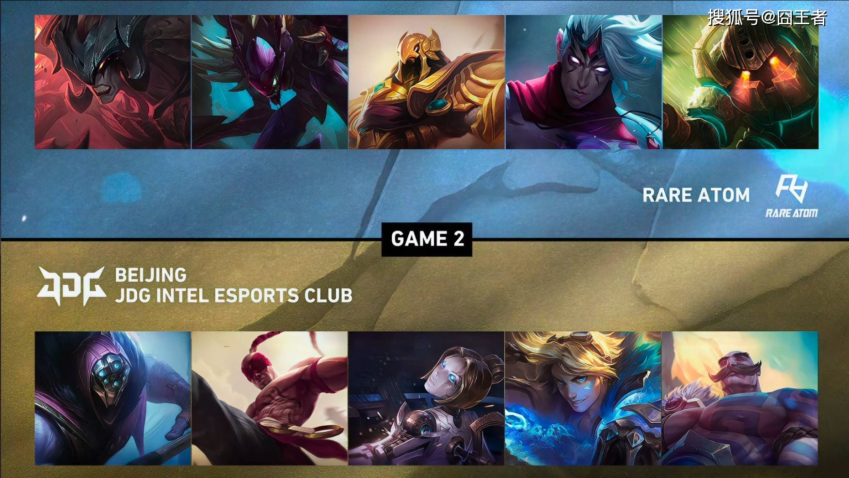 第二局比赛,RA蓝色方,禁用梦魇、艾希、妮蔻、卢锡安、霞,选用剑魔、螳螂、沙皇、韦鲁斯、泰坦;JDG红色方,禁用妖姬、卡莉斯塔、兰博、芮尔、波比,选用贾克斯、盲僧、发条、伊泽瑞尔、布隆