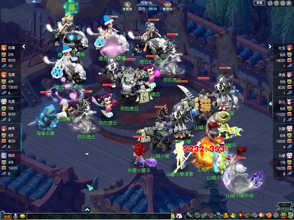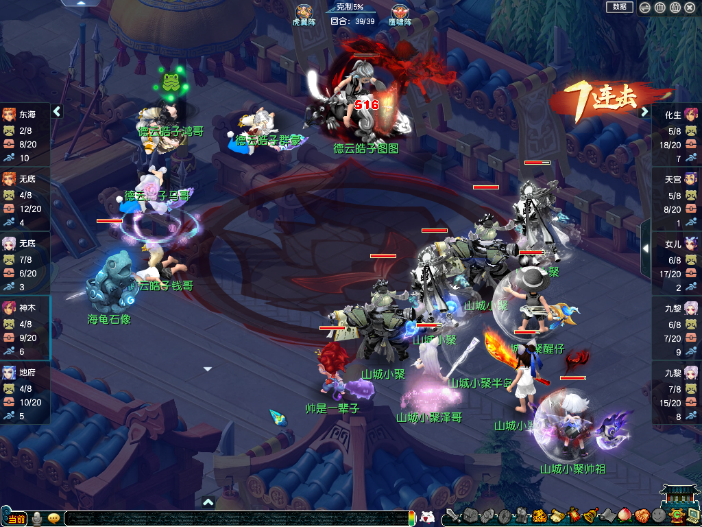 进入比赛后,德云皓子(对战方)采用了“东海、无底、无底、辅助神木、地府”组成的点杀阵容,山城小聚(观战方)则是选用了“九黎、九黎、化生、天宫、女儿”组成的面伤阵容。就阵容体系来说,山城小聚有极强的面伤优势,但如果被德云皓子点倒关键点的话,就会非常难受。