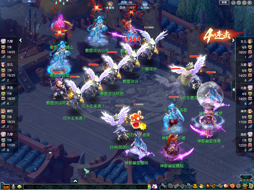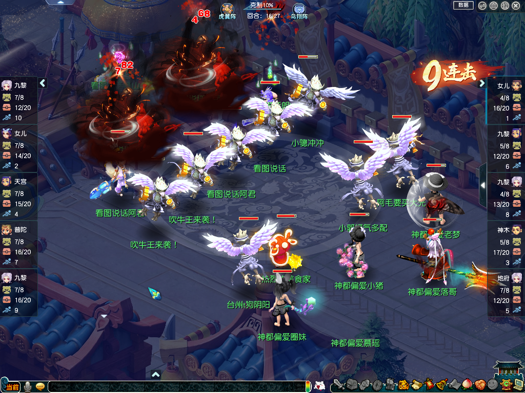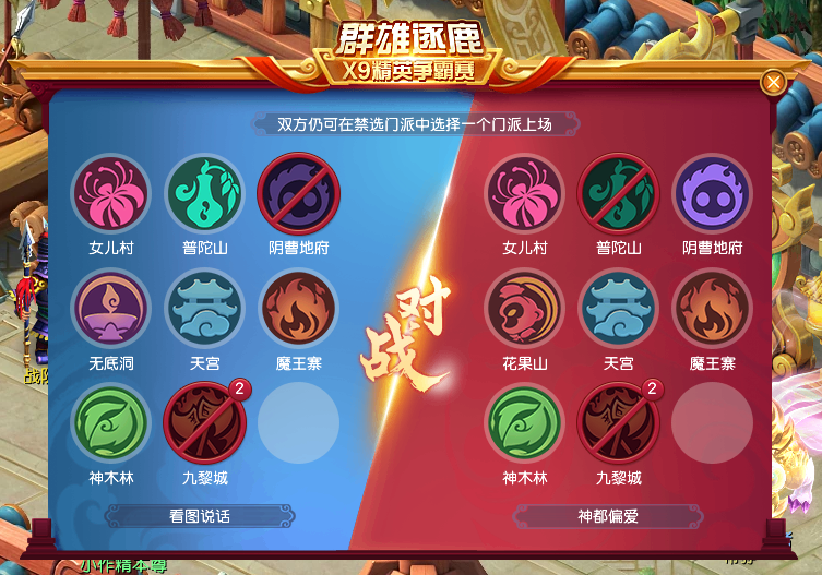 进入比赛后,看图说话(对战方)采用了九黎、女儿、天宫、普陀、九黎组成的面伤阵容,神都偏爱(观战方)则是选用了九黎、九黎、辅助神木、地府、女儿组成的点杀阵容。就阵容体系来说,神都偏爱节奏好的话,可以限制看图说话双九黎城的输出,其鸟阵优势也可以让己方九黎城拿到先出手的资格。