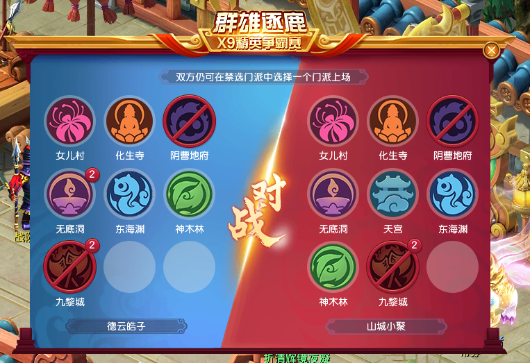 在禁选环节中,德云皓子和山城小聚都选择禁用对手地府、九黎。这就意味着,双方要仔细考虑自己上九黎、还是上地府的问题。对于山城小聚来说,不上地府就没办法压制九黎,上了九黎则要面对硬件被压制的问题。