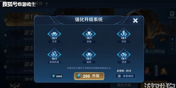 每次通关任意章节后,将获得强化碎片,可使用强化碎片前往强化升级系统中提升玩家的初始属性,提升后的初始属性将只能够携带到守卫峡谷局内中。