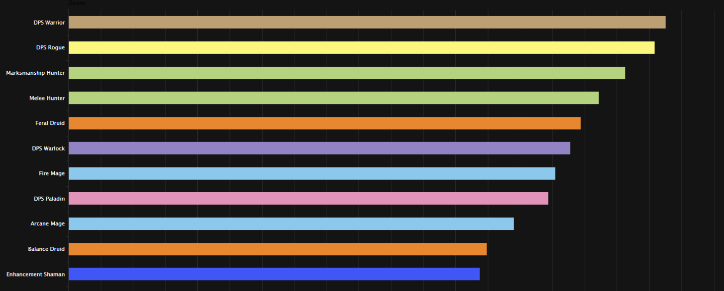 插播一条《魔兽世界》探索赛季服的新闻,最新WCL数据(统计前95%全程)出炉,战士继续领跑全职业DPS,跟第二名的盗贼差距逐渐拉大,两者牢牢占据第一集团,后面是射击猎和近战猎。