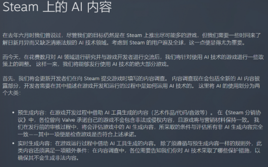 关于AI内容对游戏的影响,最近两年在业内颇受重视。作为全球最大线上游戏销售平台的Steam,就曾禁止涵盖AI成分的游戏上架。今年年初V社虽然放宽了要求,但仍需开发者描述游戏中AI使用情况,分为预生成内容和实时生成内容,以确保不会包含非法或侵权内容。