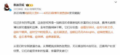 2023微博“游戏大赏”——微博年度卓越热游正式揭晓(排名不分先后),它们分别是:《蛋仔派对》、《光与夜之恋》、《和平精英》、《时空中的绘旅人》、《无期迷途》、《明日方舟Arknights》、《第五人格》、《王者荣耀》、《原神》、《英雄联盟》。