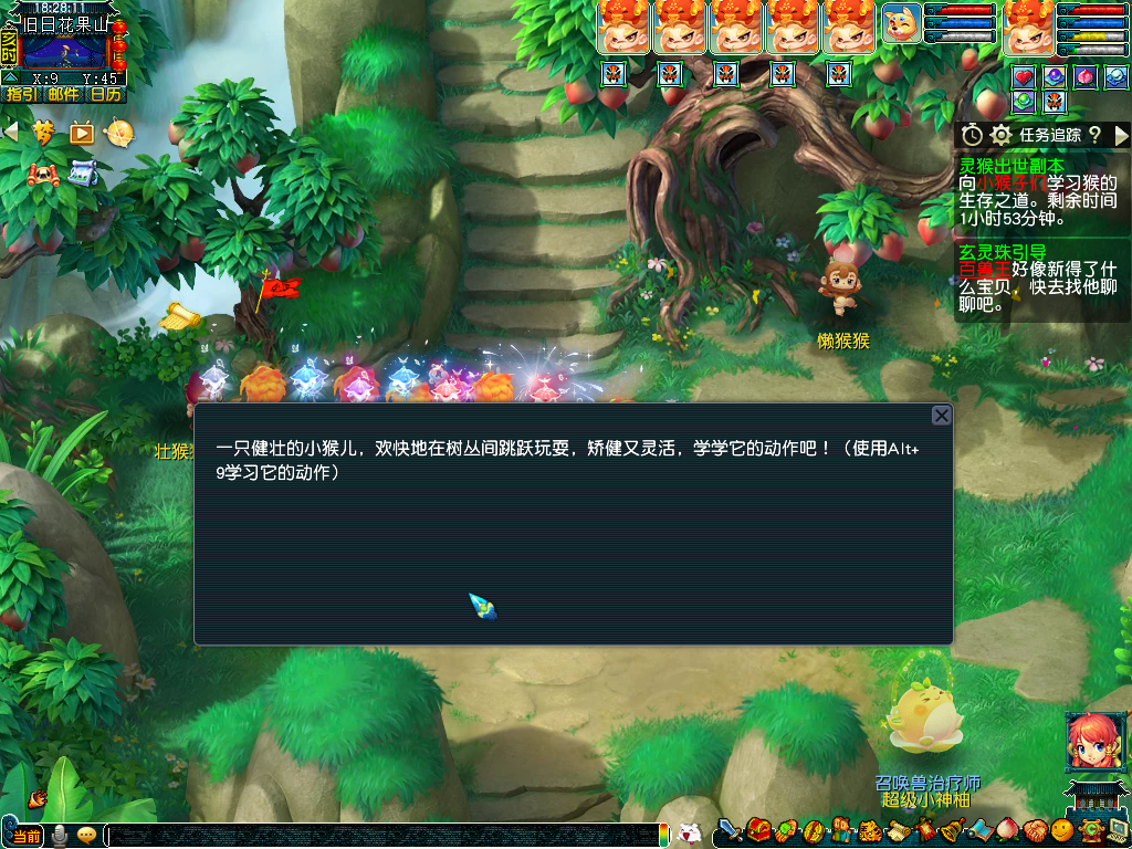 完成战斗后将会被传送至花果山地图,这个时候需要和3只小猴对话并学习它们的动作,每学习一个动作,即可获得一次经验、金钱奖励。