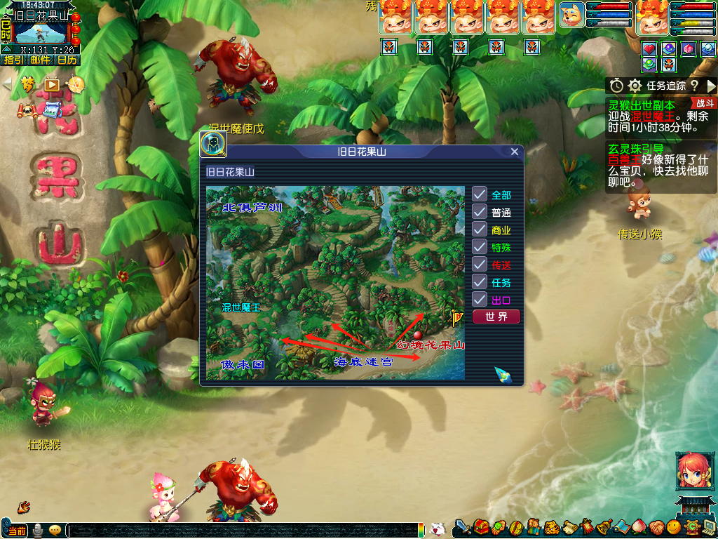 完成混世魔王的战斗后,需要分别跟猴长老和芭将军对话,对话后即可开启“游水、赛跑、爬树”等三项试炼。