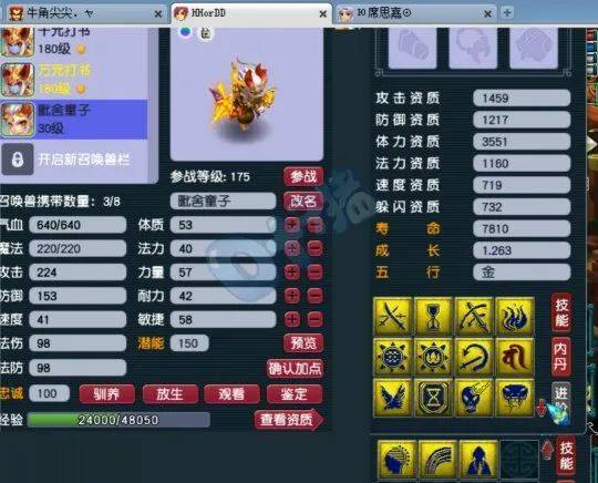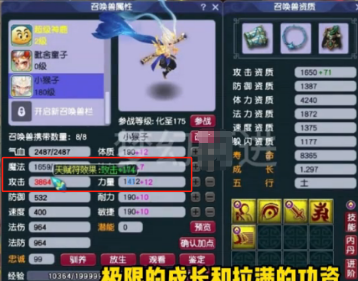 诸天正法可以提升宝宝的物理伤害,被称为“物理须弥”。有位少侠艺高人胆大,合出了5技能攻资和成长都爆满的“诸天心猿”,还将其打成全红并赐福了3个超级技能。它在全力加点且附带天赋符的情况下,攻击属性高达4038,成为首只暴力新召唤兽!