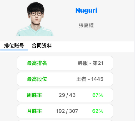 现在他更多是以一个普通玩家的心态对待英雄联盟游戏,而在年初Nuguri一度打上了韩服第21名。或许这种状态,对于他来说才是最好的吧。