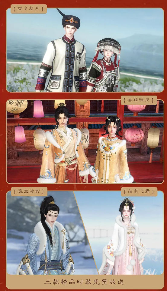 新年换新衣,在春节来临之际《逆水寒》手游还将会为玩家送上全新的时装,不仅有《奢香夫人》联名款时装【畲乡赶月】,让你体验到少数民族的风情文化,同时还有【春禧满岁】这样寓意颇佳瑞兆丰盈的传统时装。除此之外贴合冬季主题的【澄空冰轮】以及【落蕊飞霜】也不容错过,三款时装免费送,主打一个豪横~