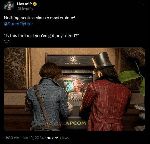 今日,《匹诺曹的谎言》官推发布一张宣传图,或预示将和《街头霸王6》进行联动。宣传图中,两名游戏中的角色中正在一台写有Capcom的街机前进行《街头霸王6》的对战。