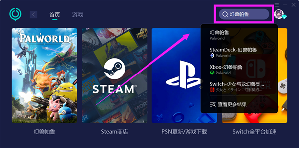 目前比较推荐用UU加速器,他的加速效果比较好,而且能够支持Steam和XGP所有平台的游戏加速,使用起来也比较方便,在搜索栏中搜索【幻兽帕鲁】即可一键完成游戏加速。
