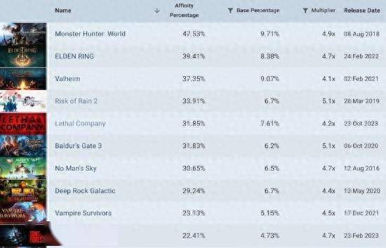 据外媒GameDiscoverCo统计数据(Steam平台),在玩过《幻兽帕鲁》的玩家中,有47.53%的玩家玩了《怪物猎人:世界》,39.41%玩过《艾尔登法环》,37.35%玩过《英灵神殿》。