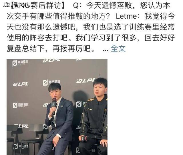 在赛后采访中,主教练let me也是公开回应了这个问题,他表示,今天没有那么的遗憾,我们也是选了训练赛里经常使用的阵容去打,学习了很多,回去好好复盘总结,再接再厉。说实话,这个回应是比较官方的。开启直播之后,明显能够感觉到他的状态出现了一些问题,甚至还在连麦的过程当中泪洒直播间。公开表示想过今天会输,但是没想过会输成这个样子,可能自己也有一定的问题吧。以为卢米没有那么的强,但是今天看来确实是非常厉害的组合,是我的BP让下路难受了。
