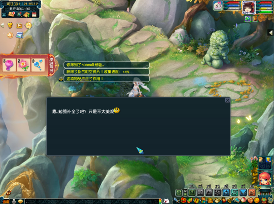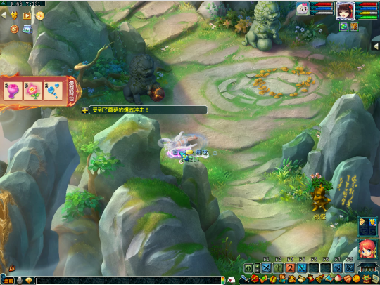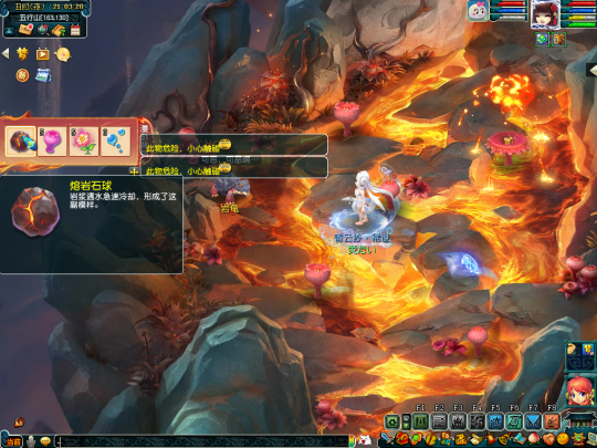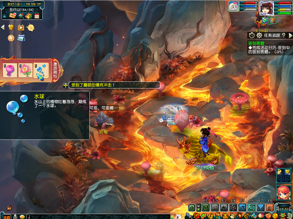 做第三个任务前,需要把水球丢给坐标(163,130)的熔岩龟,这个时候水球会变成熔岩石球,将熔岩石球带到坐标(74,143)的石狮子处使用一下,即可完成解密。