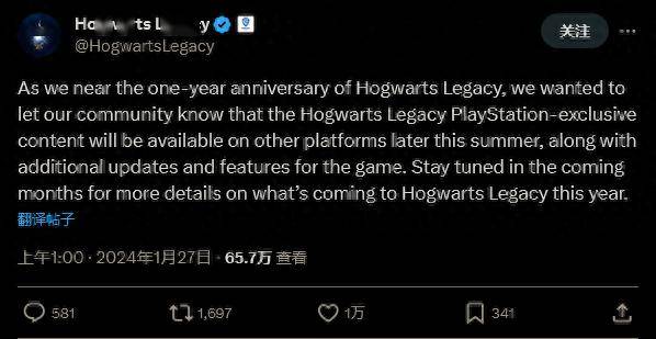 《霍格沃兹之遗》官方日前在推特上宣布,在游戏推出一周年之际,游戏原本在 PlayStation 主机上的独占内容将于今年夏天晚些时候在其他平台上推出。官方表示具体信息以及游戏今年更多内容的详情将于未来几个月内公开。