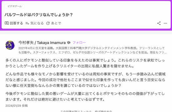 日前,前任天堂设计师今村孝矢回答了网友们提出的问题:《幻兽帕鲁》是不是抄袭?