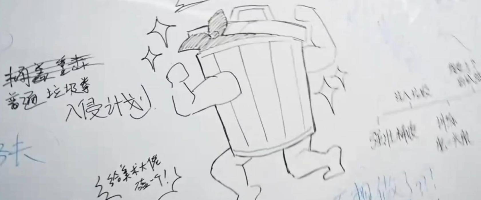 比如在直播中有一块白板,从白板上就能看到米哈游员工是如何设计新角色“王下一桶”的。他们先是照常给美术大大磕一个,之后讨论起了王下一桶的攻击方式,原本这个新怪物设计的攻击方式是用桶盖重击的,在后续中被改成了普通垃圾拳。
