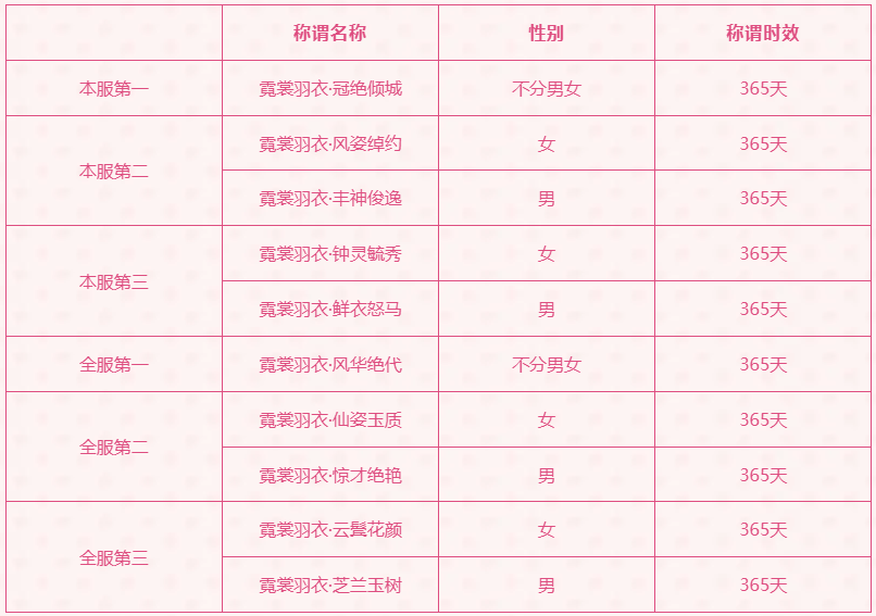 本次华服大赛还为少侠们准备了丰厚的奖励,获得对应主题分数全服或本服前三的少侠,将获得限时365天的定制称谓名称,同时全服前三和本服第一的少侠还会获得额外的物品奖励。并且,每期比赛中,全服前三获得的定制称谓特效效果、本服第一获得的限时祥瑞效果均不相同。