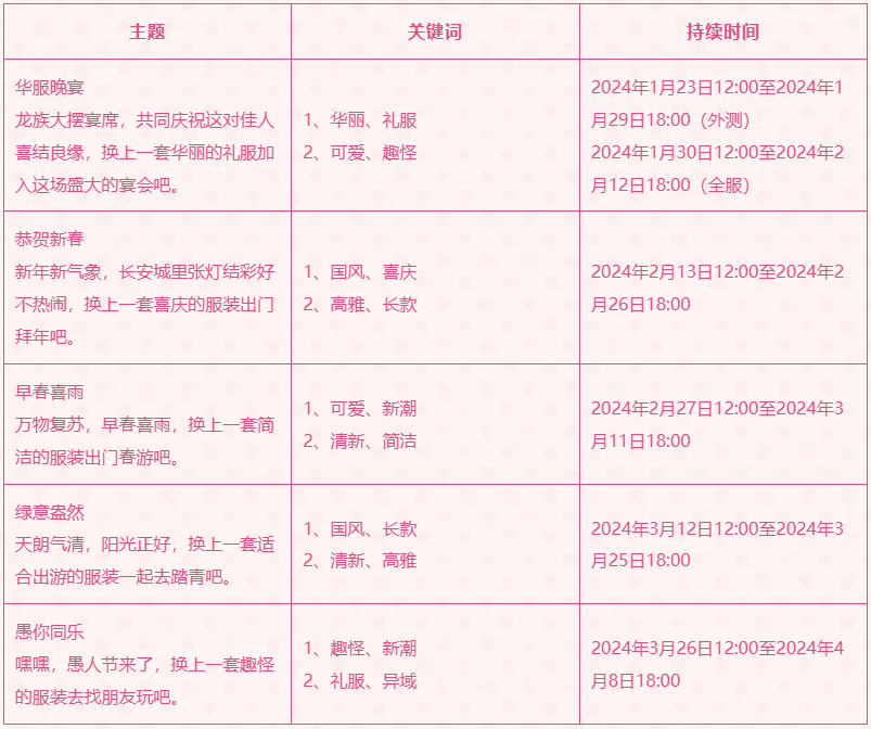 本次活动一共5期主题,分别为【华服晚宴】、【恭贺新春】、【早春喜雨】、【绿意盎然】、【愚你同乐】。每一期的主题不同,关键词也各有不同,少侠们需要选择符合对应关键词的外观穿着,才能保存参赛衣柜成功报名。