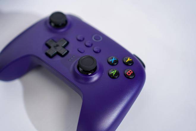 从正面看,手柄的按键布局遵循了主流设计,包括左摇杆、十字键、右ABXY键和摇杆。星夜紫的材质质感独特,磨砂和颗粒的组合提供了良好的摩擦力,有效避免了激烈操作中的打滑情况。整个手柄采用耐用的ABS材质。此外,它还广泛兼容iOS、macOS、Steam Deck、Android和Windows 10等系统,让玩家可以在各种设备上使用。