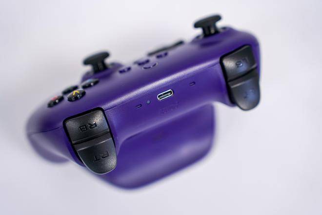 背部设计同样出色,中心有一个拨杆,表面标注D/X,分别代表D蓝牙模式和X有线模式以及2.4G模式。下方则是三个充电触点以及P1/P2背键。这些背键可以根据PC端驱动进行自定义设置,尤其在玩技能要求高的FPS游戏时非常有用。背键的尺寸适中,中指和无名指可以轻松触及。顶部则是肩键区域,包括LT/RT和LB/RB四颗肩键。LT/RT采用微曲小斜面线性弹力扳机设计,内置快弹力硅胶和弹簧,实现双弹力响应。LB/RB则是点按触发式设计。肩键中心是Type-c充电及有线模式接口。侧边是充电提示灯。