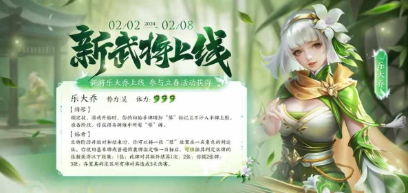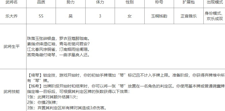 乐大乔是3血2技能吴将,【绮琴】锁定技,游戏开始时,你的初始手牌增加“琴”标记且不计入手牌上限。准备阶段,你获得弃牌堆中所有“琴”牌。 【姊希】出牌阶段开始时和结束时,你可以将一张“琴”放置在一名角色的判定区。你使用基本牌或普通锦囊牌指定唯一目标后,可根据其判定区牌的张数获得以下效果: 1张:此牌对其额外结算1次; 2张:你摸2张牌; 3张:弃置其判定区所有牌对其造成3点伤害。