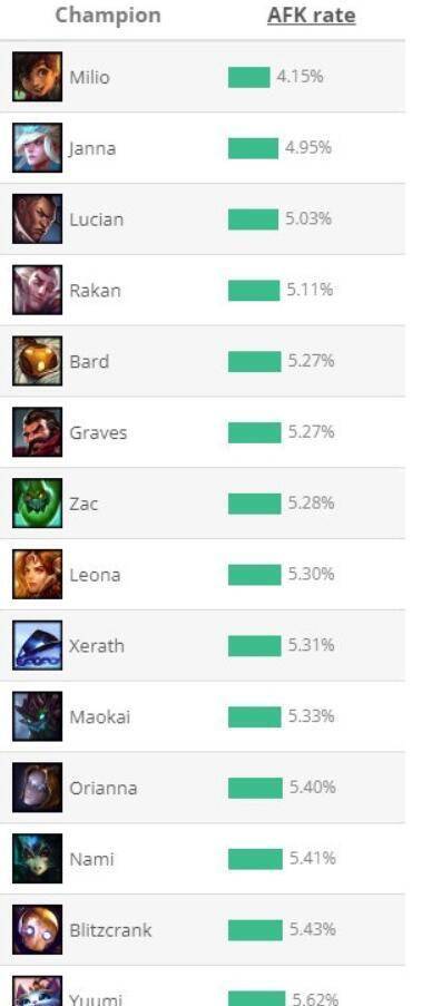 也因为这个调整,最近一些英雄的排行榜也发生了变化,前几天刚公布了一个英雄上场率的排行榜,而最近官方又公布了一个数据,那就是S14新赛季的英雄挂机率排行榜,从数据中看得出来,一二名都是上单英雄,辅助最不会挂机。