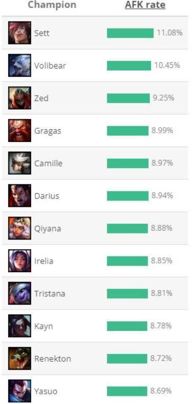 我们看到这里面瑟提的挂机率高达11.08%,狗熊也有10.45%,这两只英雄也是挂机榜里突破10%的英雄,小编有点不明白,这两只英雄的操作难度并不高,而且左右比赛走向的能力也不是特别强,为什么挂机率会这么高呢?