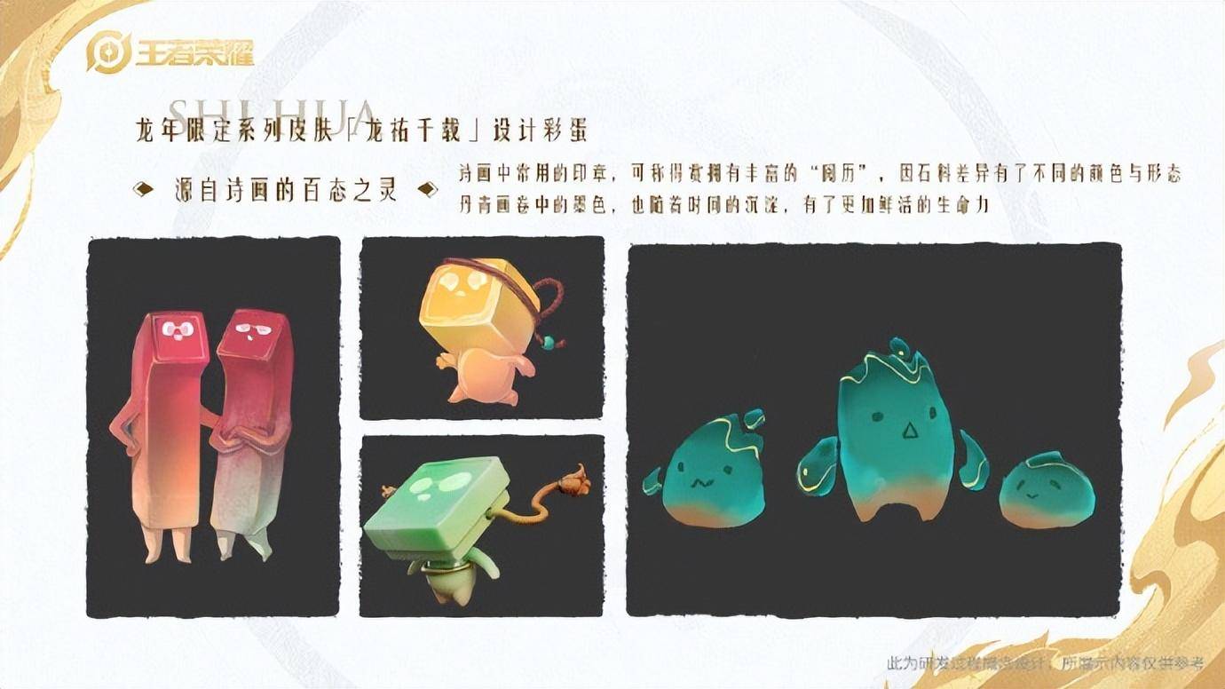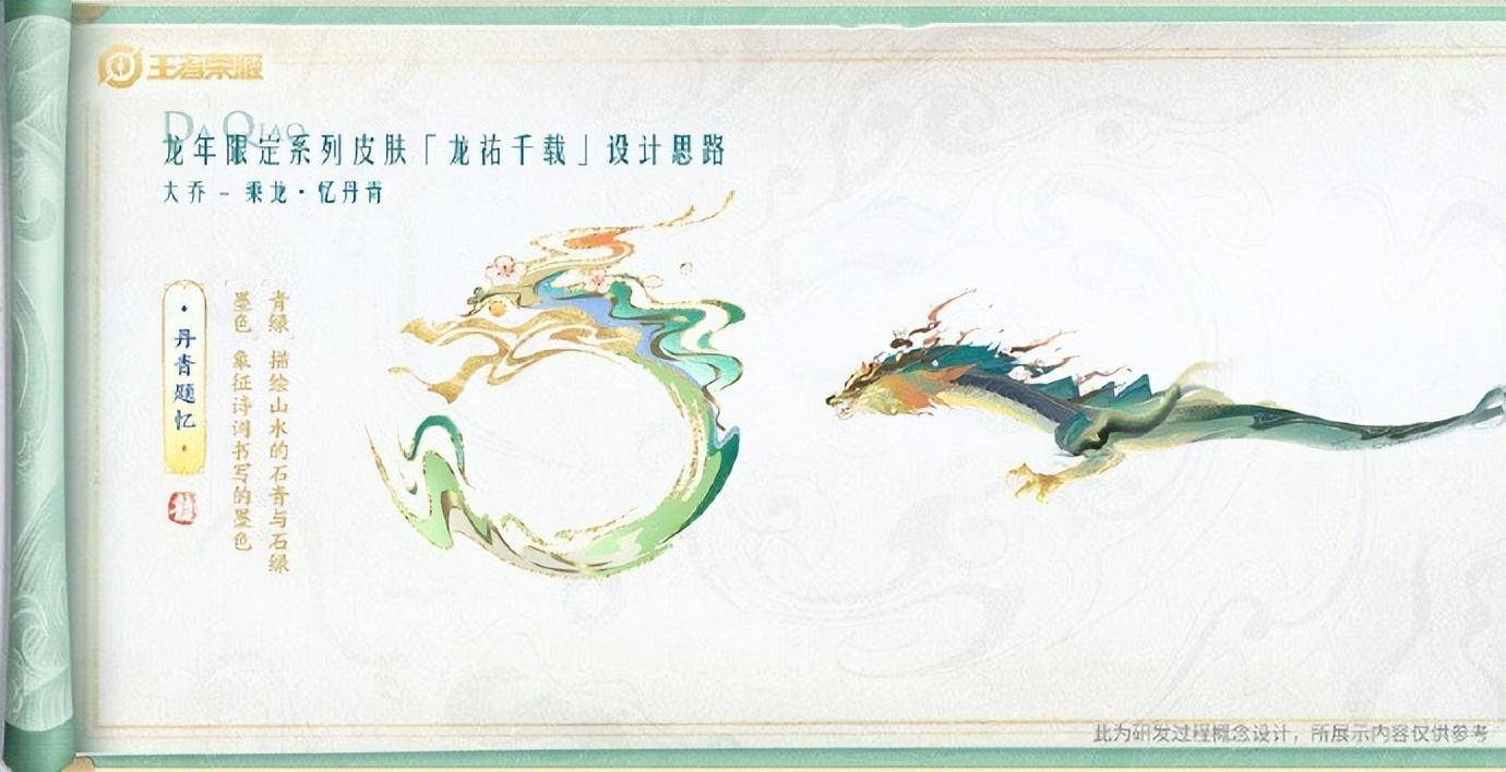 在王者荣耀的纪录片中有很多设计师的手稿,在设计大乔乘龙·忆丹青的手稿中,龙的形象主要以青色为主,绘画笔触随意,但有很深的意境,有种写意画的味道。另外还有可爱的百态之灵,是一枚小印章形象,这是丹青中最常见的物品,在设计手稿中有很多不同的设计样品,每个都很俏皮可爱,生命力十足。