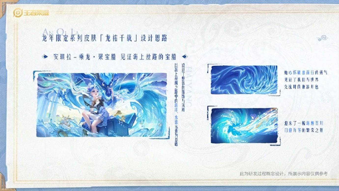 在龙年限定的五款皮肤中,主要从五个角度对中华文化进行切入,有铭钟鼎、淬吴钩、问璇玑、忆丹青、聚宝船,赵云的乘龙·铭钟鼎皮肤以青铜鼎为主题,鼎在古代文化中是沟通万物和祭祀的器物,主要是用来守护天地安宁,表达古代人民的愿景。大乔-乘龙·忆丹青皮肤则以丹青为元素,回顾了古代历史中的诗词和山水画,这些集结了很多古人智慧的结晶。安琪拉-乘龙·聚宝船则表达了古代东方与世界交流的繁荣景象。