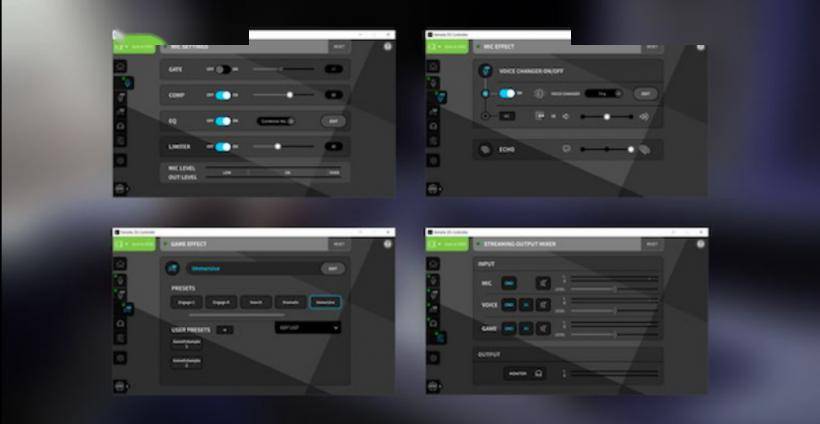 在 ZG 软件中定制你的声音和游戏声音设置,再通过 ZG02 调音台预设按钮即时调用它们。麦克风效果选项包括压缩、限制器、混响、音高、广播音等,还有一个用于回声的按钮。游戏效果选项包括 3D 环绕声、专注模式和 3D 聊天空间。