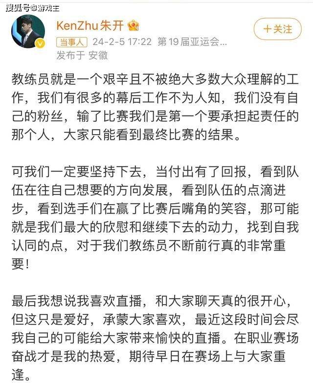 让我们比较意外的是,朱开竟然公开回应了这个事情,表示教练员就是一个艰辛且不被绝大多数大众理解的工作。我们有很多的幕后工作不为人知,可我们一定要坚持下去,当付出有了回报,看到队伍在往自己想要的方向发展可能就是我们最大的欣慰和努力。最后,他表示喜欢直播,但这只是爱好,这段时间会尽力给大家带来愉快的直播职业赛场才是他的热爱,期待尽早在赛场与大家重逢。从回应中能够感觉到他是有可能担任rng战队的教练的。