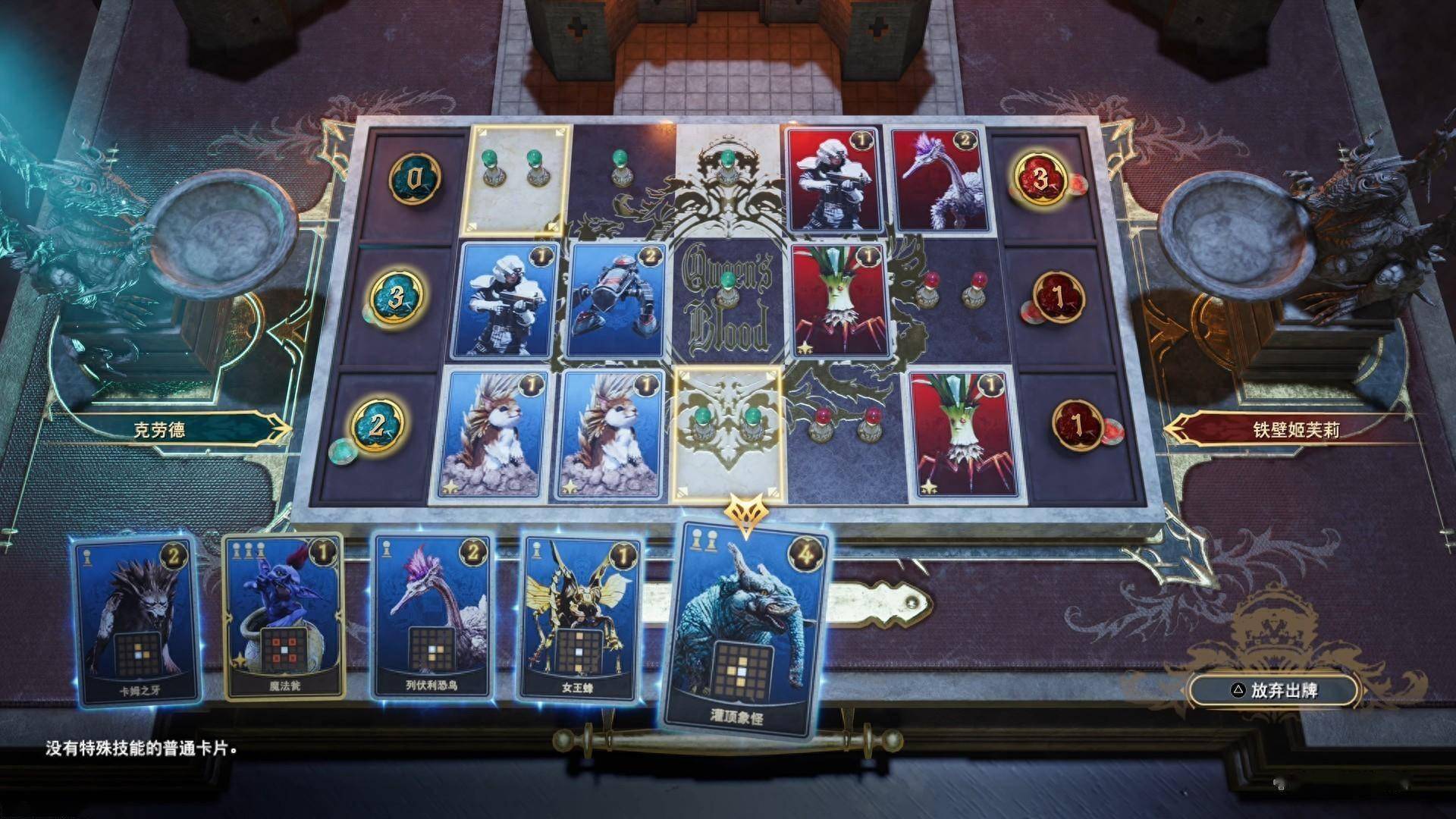 开头我们首先来到的是卡姆镇。作为游戏初期造访的都市,在这里可以学习到一些基本的东西,包含武器强化、学习技能、好感度事件等等,系统较前作有一些变化,而即使你没玩过前作也可以从头学起来。另外在这里还能玩到本次新增的一个卡牌对战小游戏「女王之血」。具体规则就不细说了,看游戏里的教程就能明白。在世界各地你可以找到特定的NPC打牌,赢下来就能获取新的卡牌,另外你也可以通过卡牌商和一些支线任务获取卡牌,最后不断强化自己的卡组使对战更为有利。卡牌玩法虽然不复杂但十分有研究性,真要细玩的话也挺杀时间的,别看视频里我一路赢,是因为输的都被剪掉了……