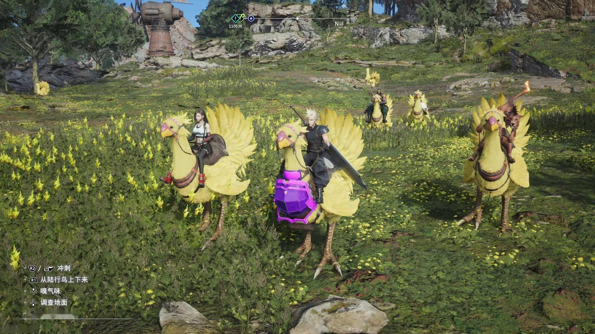 一段剧情后我们就正式来到了可自由探索的开放地区「格拉斯兰」,就如同爱丽丝的一句台词“这才是真正的开始”。接下来要做什么选择可就多了,不过还是建议先跟着主线引导走拿到陆行鸟,除了可以移动快一些外陆行鸟也是我们寻宝的好帮手,很多隐藏的道具都需要利用陆行鸟的嗅觉才能发现。这里可以提两句游戏的跑地图,虽然没有跳跃功能,但在跑路中遇到不太高的坡或障碍物角色都会自动跳跃或翻越,陆行鸟也一样。虽然少了点爬山的乐趣,但一定程度上简化了操作。