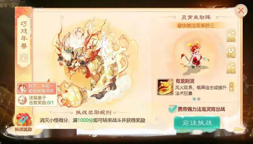 2)每击败一次送福童子,都将为一位队员送上随机奖励;除夕、大年初一更有可能获得春节召唤兽灵宵哦;
