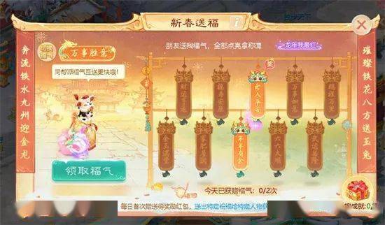 春节喜庆,百姓均爱讨彩头。在春节期间,给各位好友拜年送出祝福,首次送出即可获得红包,集齐10个特殊祝福有称谓奖励,送出指定祝福给特殊的游戏人物还可升级称谓~