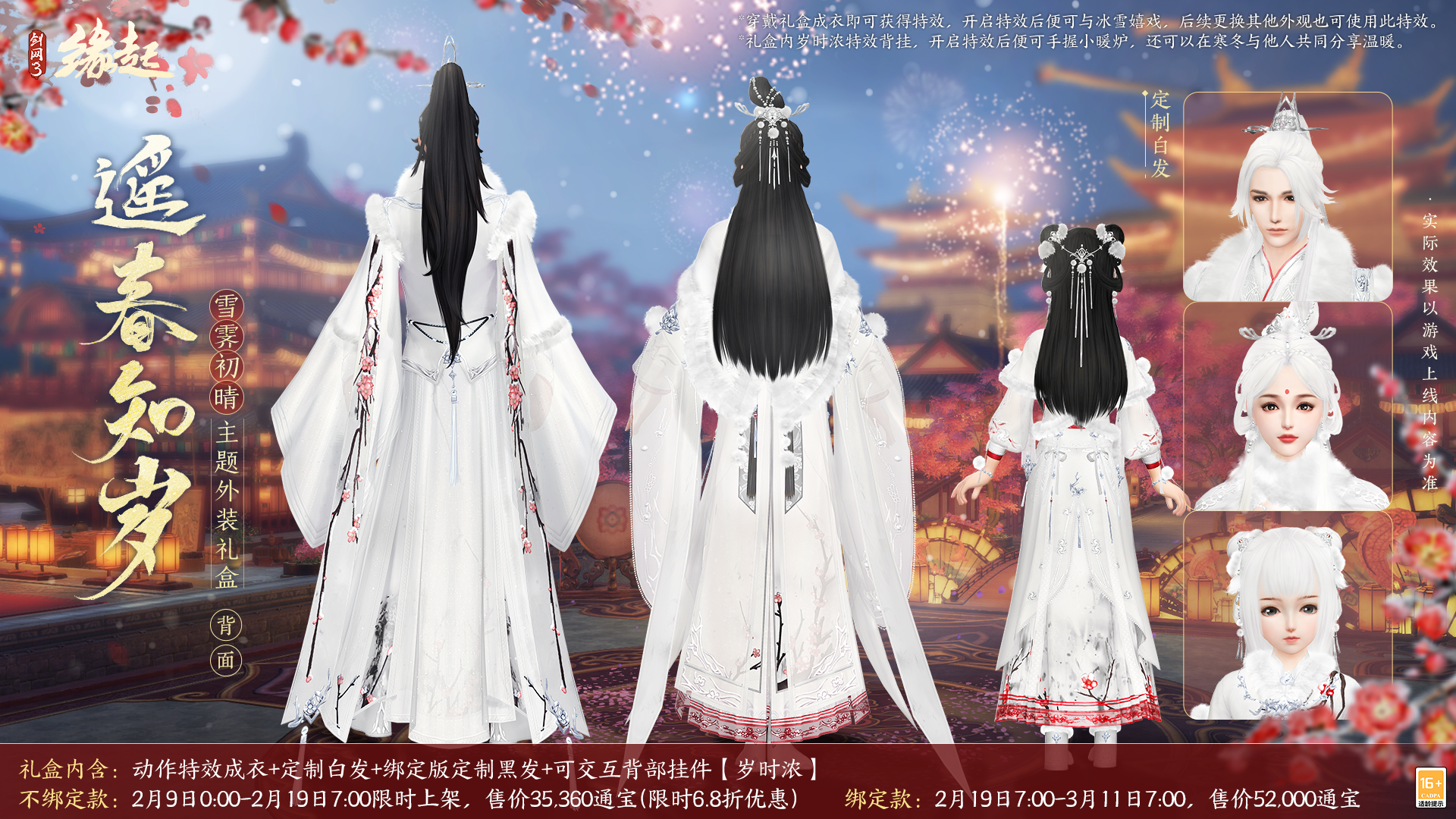 礼盒内含动作特效成衣+定制白发+绑定版定制黑发+可交互背部挂件「岁时浓」。不绑定款将于2月9日0:00-2月19日7:00限时上架,售价35,360通宝(享限时6.8折折扣);绑定款将于2月19日7:00-3月11日7:00限时上架,每款售52,000通宝。