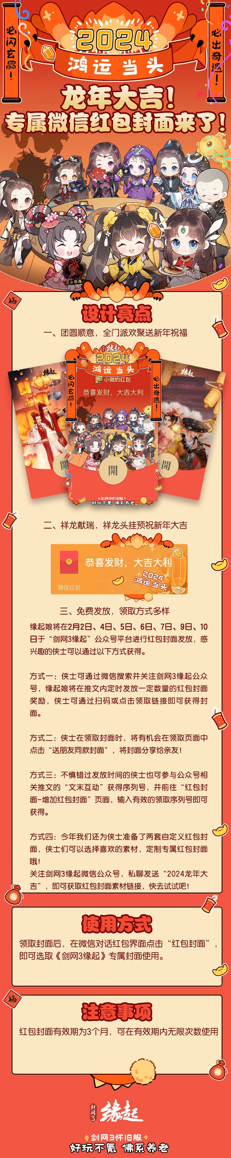 龙年大吉,团圆顺意!全门派欢聚送新年祝福专属微信红包封面来了!2月2日至2月10日,活动期间,侠士可关注剑网3缘起公众号,每日推文内将发放一定数量的红包封面奖励,侠士可通过扫码或点击领取链接获得;也可在领取页面中点击“送朋友同款封面”,将封面分享给亲友;若不慎错过发放时间,也可参与公众号相关推文的“文末互动”获得序列号,凭此获得红包。福满临门红包来,快叫上亲朋好友一起来参与吧!