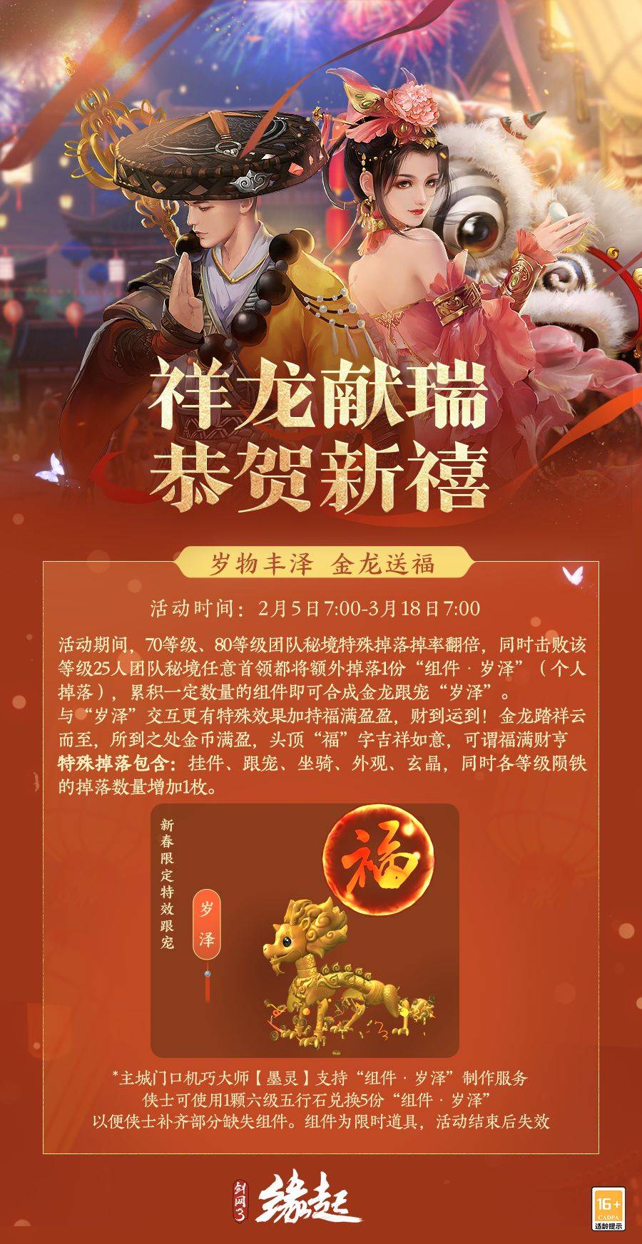 丰年稔岁,泽被万物。活动期间,70等级及80等级团队秘境特殊掉落掉率翻倍,同时击败70等级或80等级25人团队秘境任意首领都将额外掉落1份【组件·岁泽】,累积组件即可合成金龙跟宠【岁泽】。