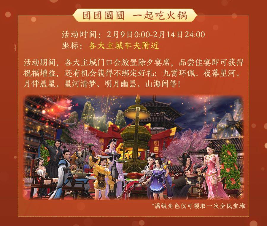 2月9日0:00至2月14日24:00活动期间,各大主城门口设宴会宝堆共聚团圆,满级侠士可前往参与摸取,有概率获取不绑定款“九霄环佩”、“夜幕星河”、“月伴晨星”、“星河清梦”、“明月幽昙”、伍级五彩石、陆级五彩石等海量好礼!首次赴宴还将附赠神秘书信一份,暖心寄语祝侠士龙年大吉,阖家安康!