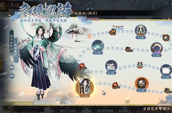 玩家在冬境巡游活动中通过完成任务,能够获得花车经验,提升花车等级,领取奖励,70级时还能领取到SP侍宵姑获鸟的典藏庆典皮肤,80级时能够在一定范围内,自选一张SSP/SP式神获得。