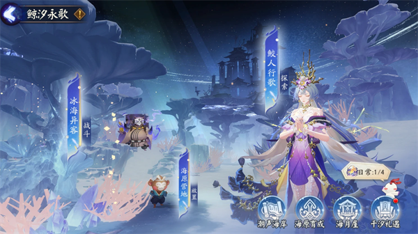 在【鲸汐永歌】活动中,玩家可以通过冰海异客的爬塔战斗活动、鲛人行歌与海原营地的休闲收菜活动,获取大量活动货币,兑换勾玉、蓝票、黑蛋、日和坊新皮肤等资源,和一张随机SSP/SP式神召唤券