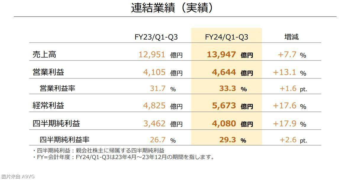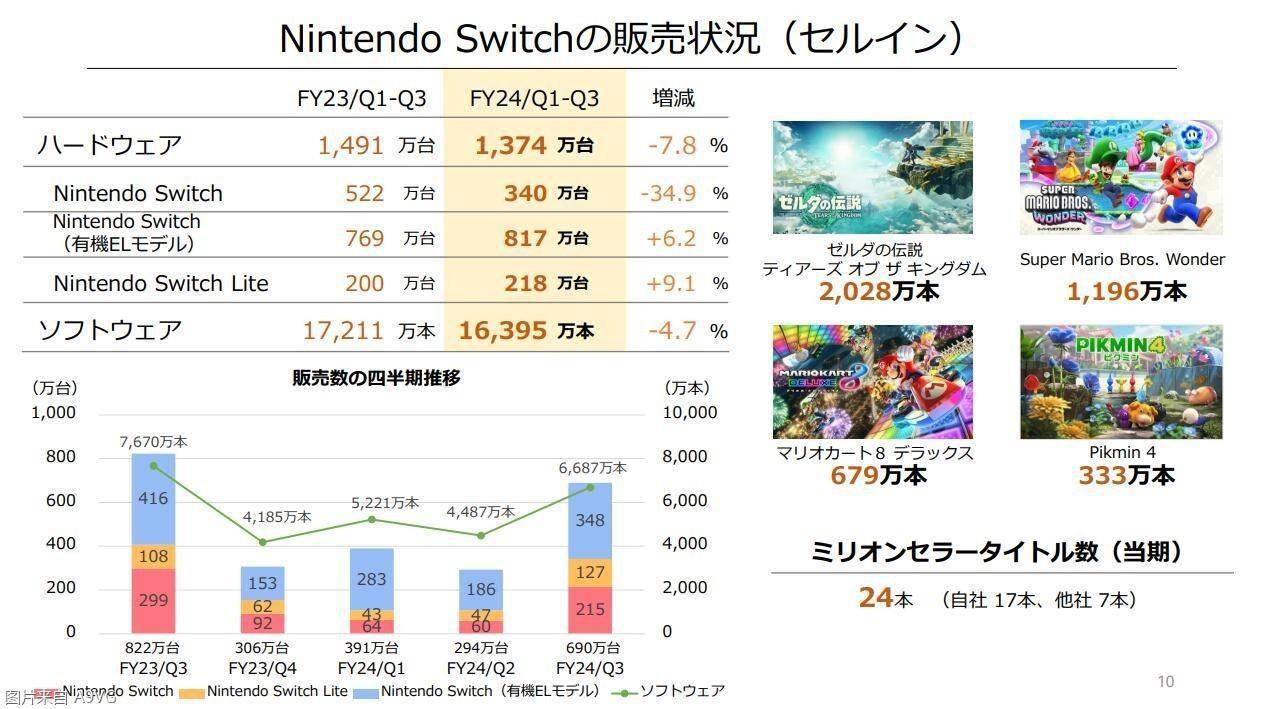 任天堂今日公开23-24财年Q3财报,截止至Q3(23年4月~12月)该财年销售额13947亿日元同比增长7.7%、营业利润4644亿日元同比增长13.1%。Switch累计销量1亿3936万台、软件12亿10万份。