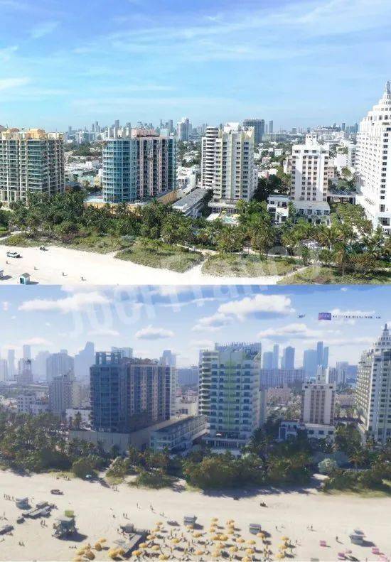 在预告片的开头有一个南海滩的镜头,而博主@OfficialJoelF在昨日凌晨用无人机实景拍摄了南海滩的照片。并将其与《GTA6》预告中的画面进行了对比。