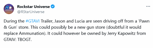 《GTA6》预告中,有玩家发现露西娅和男主杰森从一家名为“Pawn & Gun”的商店驾车离开,玩家猜测它取代了Ammunation成为本作新的枪店,而Dubsta汽车后橱窗里有一个写着“钻石”的标志,进而有人将这家店与Jerry Kapowitz的身世关联在了一起。